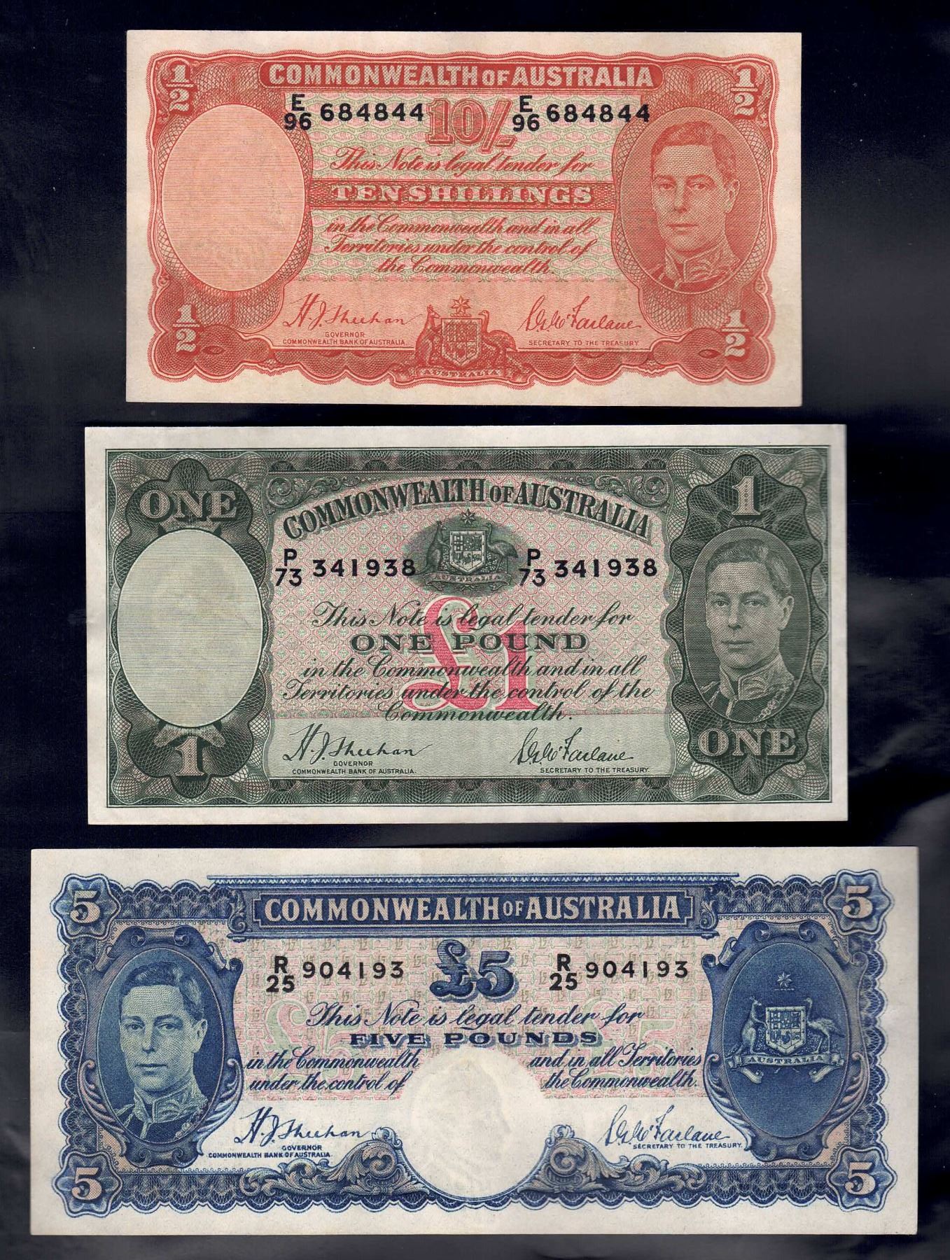 AUSTRALIA 10/-,£1,£5. 1938-39. Sheehan-McFarlane. RAREST SIGS - PART SET OF 3